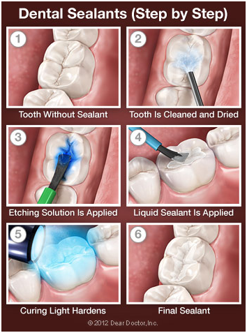 You can think of a sealant as a mini plastic filling, though please reassure your child that it doesn't “count” as having a cavity filled. Because tooth enamel does not contain any nerves, placing a sealant is painless and does not routinely require numbing shots. First, the tooth or teeth to be sealed are examined, and if any minimal decay is found, it will be gently removed. The tooth will then be cleaned and dried. Then a solution that will slightly roughen or “etch” the surface is applied, to make the sealing material adhere better. The tooth is then rinsed and dried again. The sealant is then painted on the tooth in liquid form and hardens in about a minute, sometimes with the help of a special curing light. That's all there is to it!